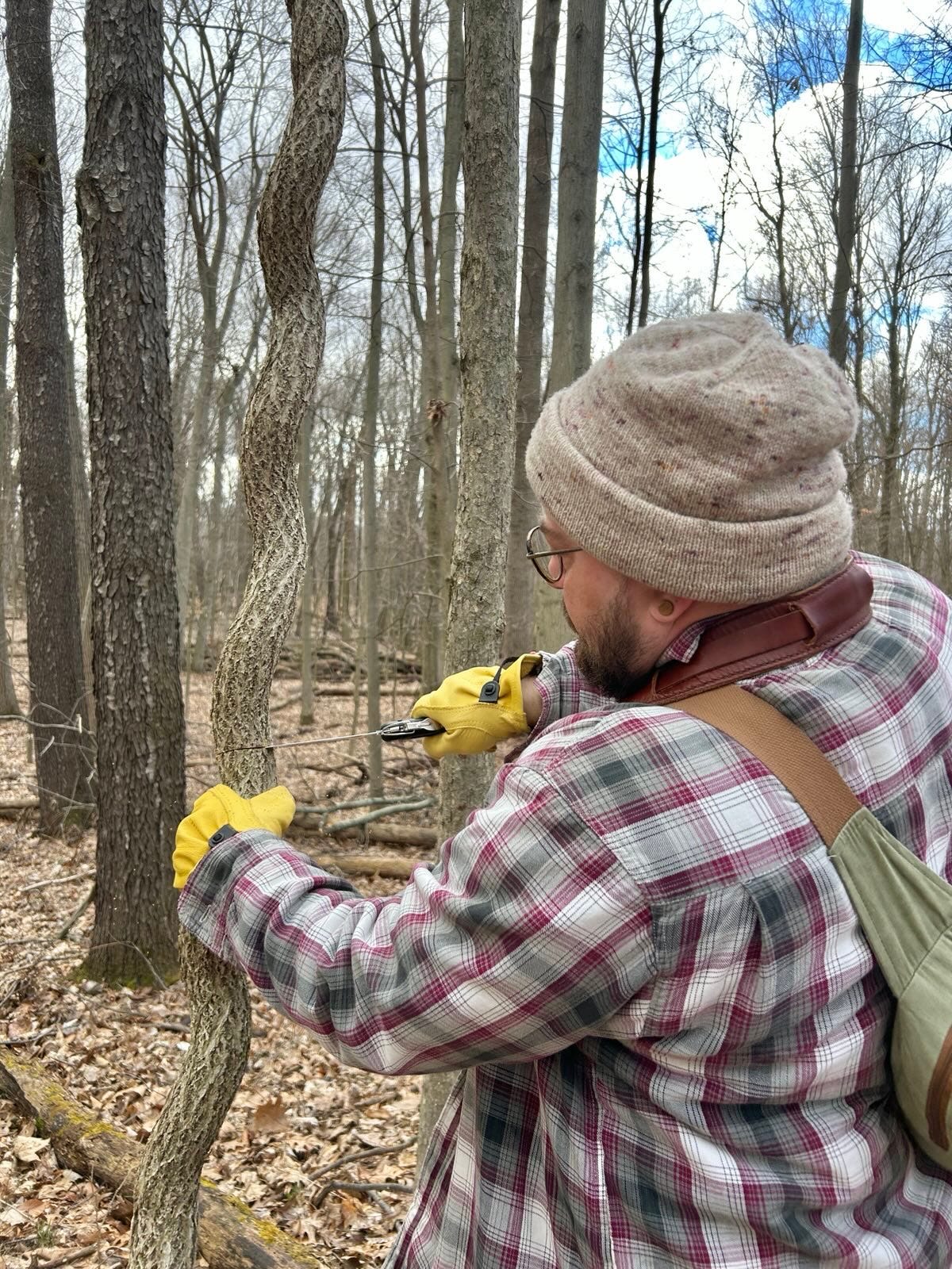 So instead of trying to kill all the bittersweet, I tried to stop the bittersweet from killing all of its neighbors. Walking in the woods throughout the winter, I brought my little folding saw, stopping regularly on the trails to cut back vines thicker than my arm, leaving them to dangle loose and heavy from the tree limbs far above. Every time I went out, I felt a complicated mix of pride and worry, glad I was doing something, but deeply uncertain about the approach I was taking.